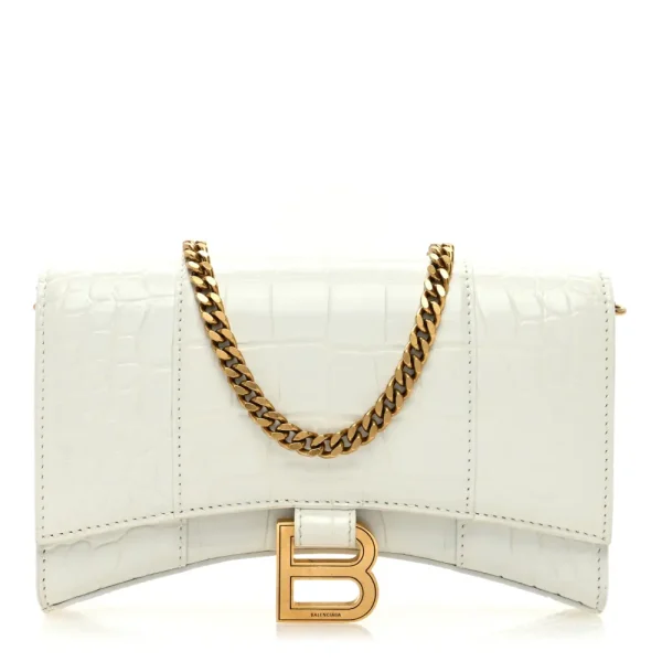 Balenciaga XS Hourglass Chain Bag White Crocodile Embossed Shiny Calfskin Leather Gold Hardware