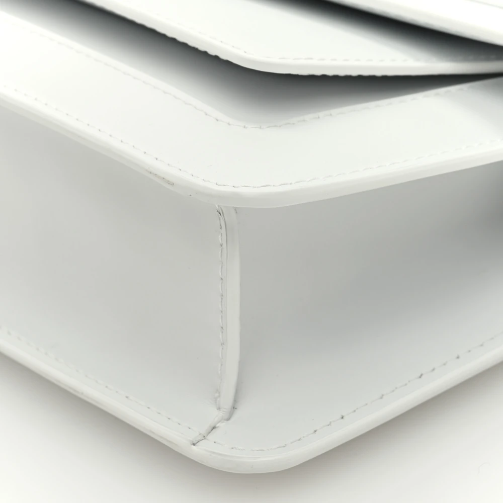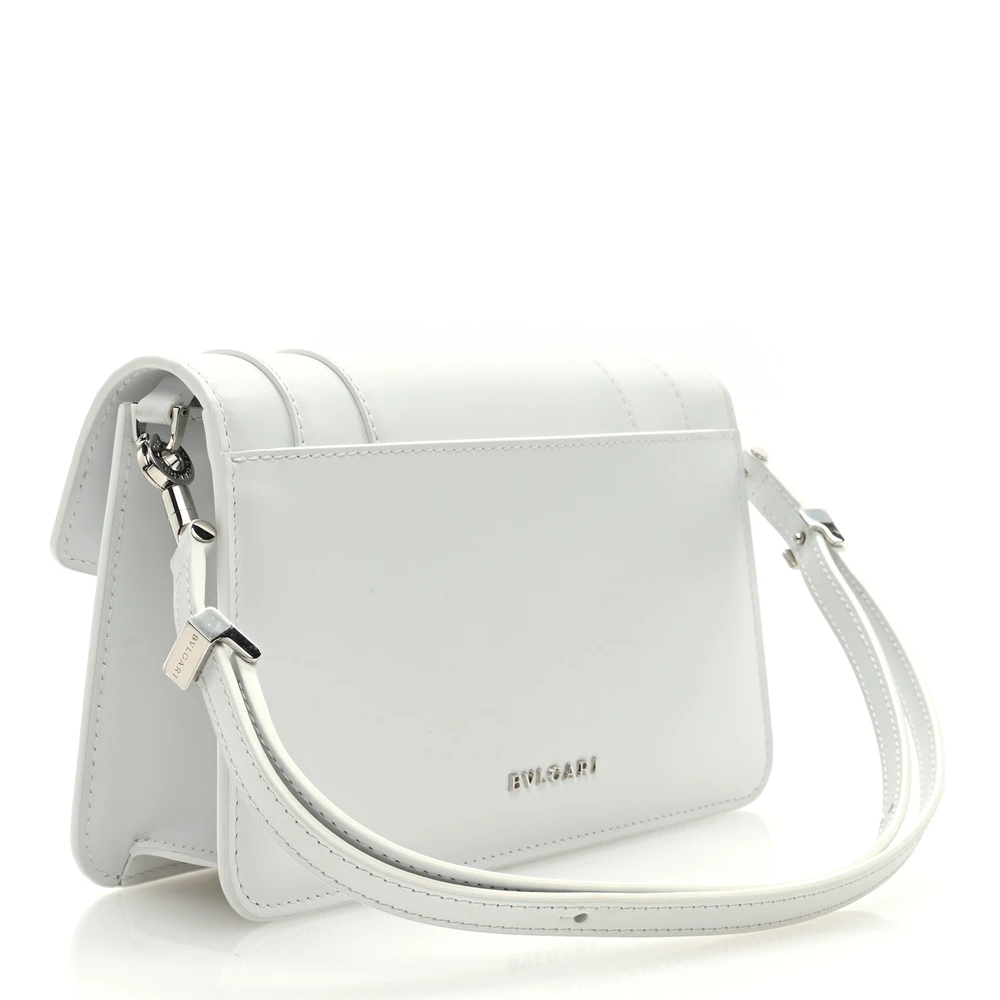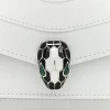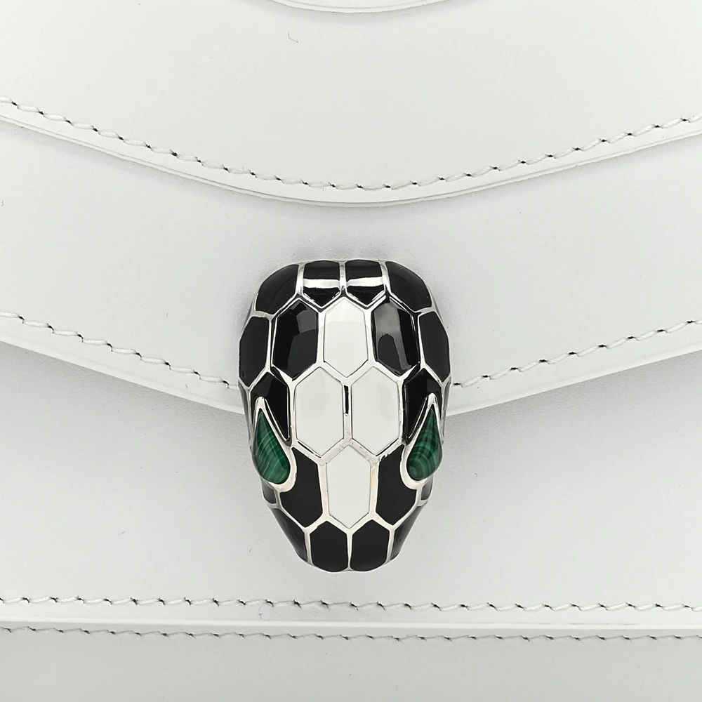 This Bvlgari Medium Serpenti Forever East West Shoulder Bag in white exudes modern sophistication. Constructed from smooth calfskin leather, it features the signature Serpenti clasp in silver hardware for a striking finish. The elongated East West design provides functionality and style, perfect for carrying daily necessities with ease. The subtle opal grey shade offers a versatile and chic aesthetic. A luxurious accessory that combines practicality with elegance.