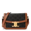 This Celine Small Teen Triomphe Bag in White/Brown combines textile and natural calfskin leather. Gold hardware enhances its timeless appeal. The adjustable strap offers versatile styling options. Perfect for casual outings or everyday use.