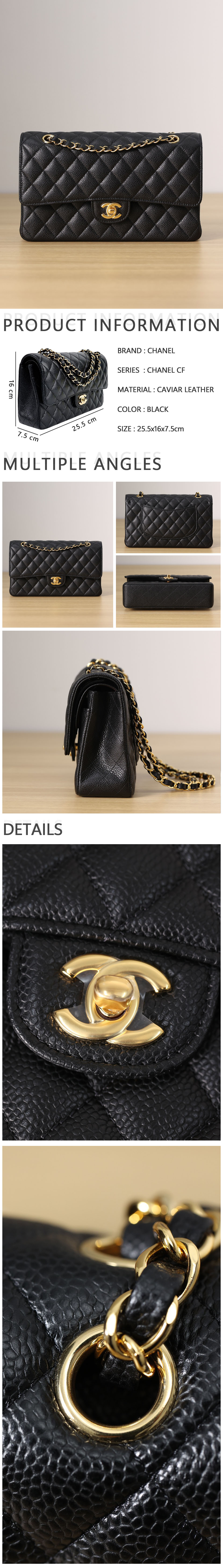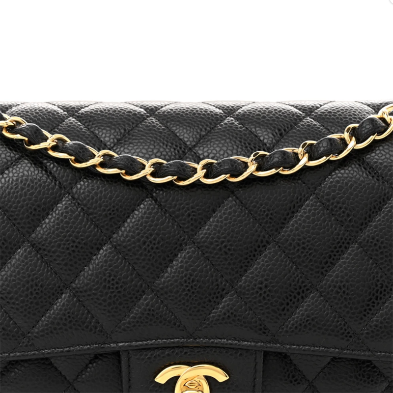 This Chanel Double Flap Medium in Black Quilted Caviar Leather with Gold Hardware is a classic and timeless design. The quilted caviar leather ensures durability and luxurious texture. Gold hardware adds a touch of sophistication to its sleek black exterior. Spacious enough for daily essentials, versatile for various occasions. A must-have piece for Chanel enthusiasts. Perfectly combines elegance and functionality.