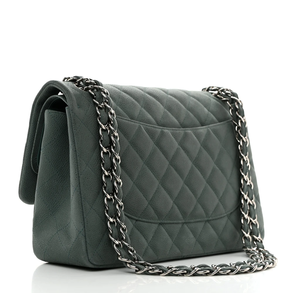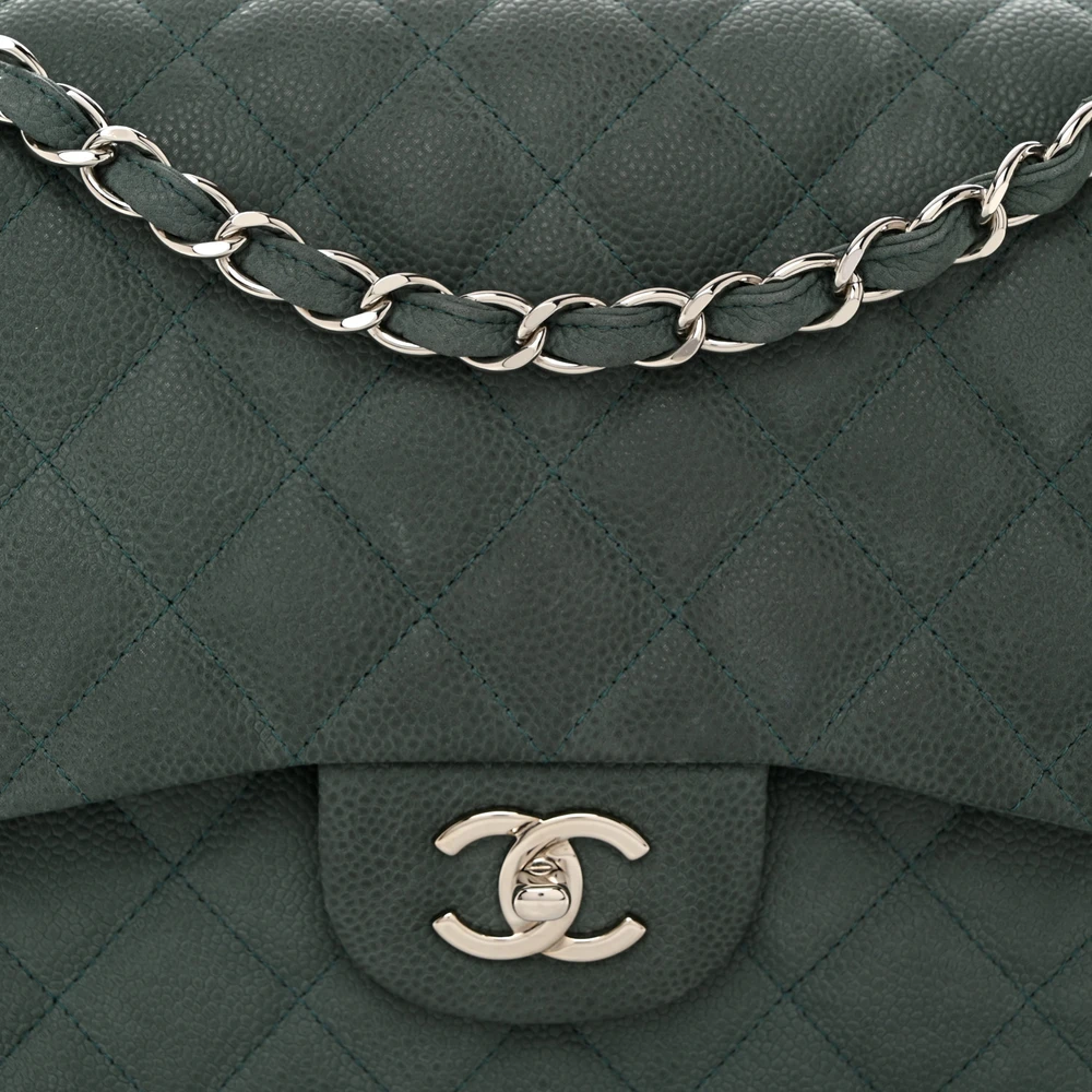 This Chanel Double Flap Jumbo in Green Quilted Caviar Leather with Silver Hardware is a stunning and timeless accessory. The durable caviar leather provides a rich texture, while the green hue adds a modern twist. Silver hardware complements the quilted design, enhancing its elegance. Spacious enough for daily essentials, versatile for various occasions. A timeless addition to any wardrobe. A must-have for Chanel lovers.