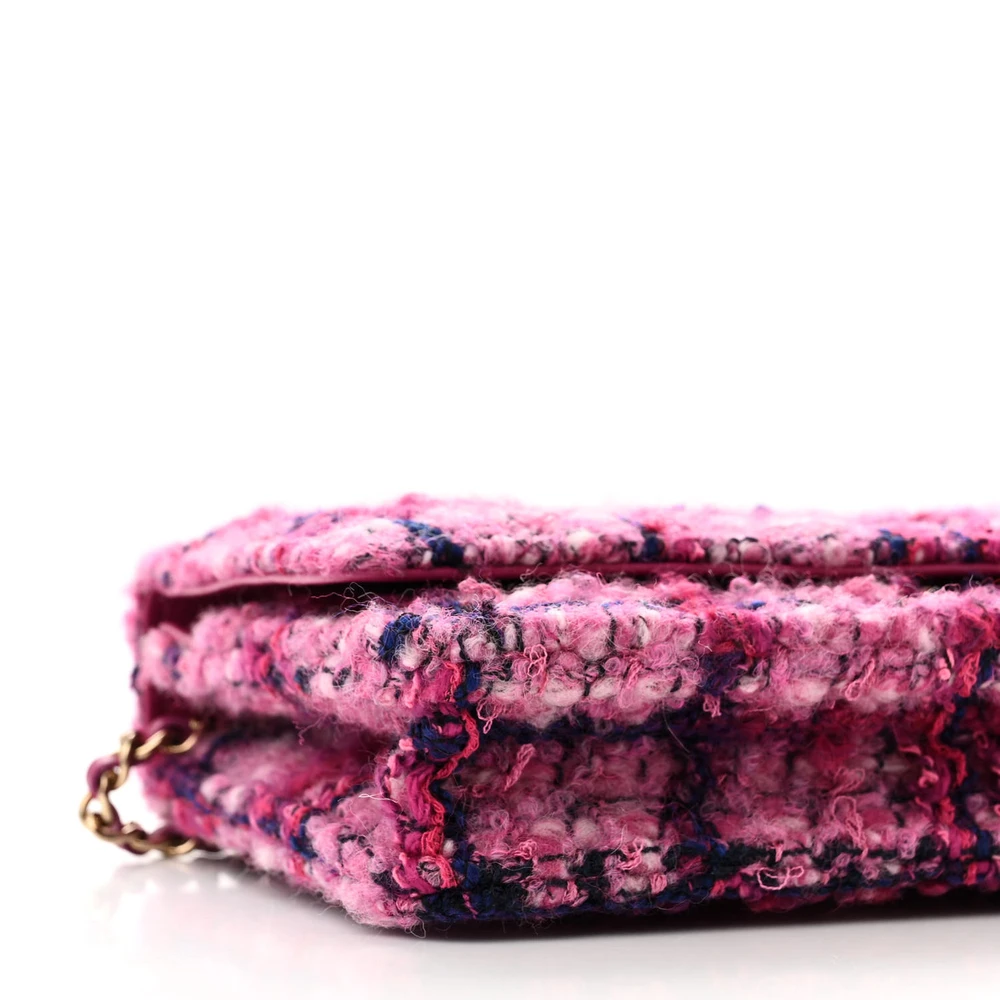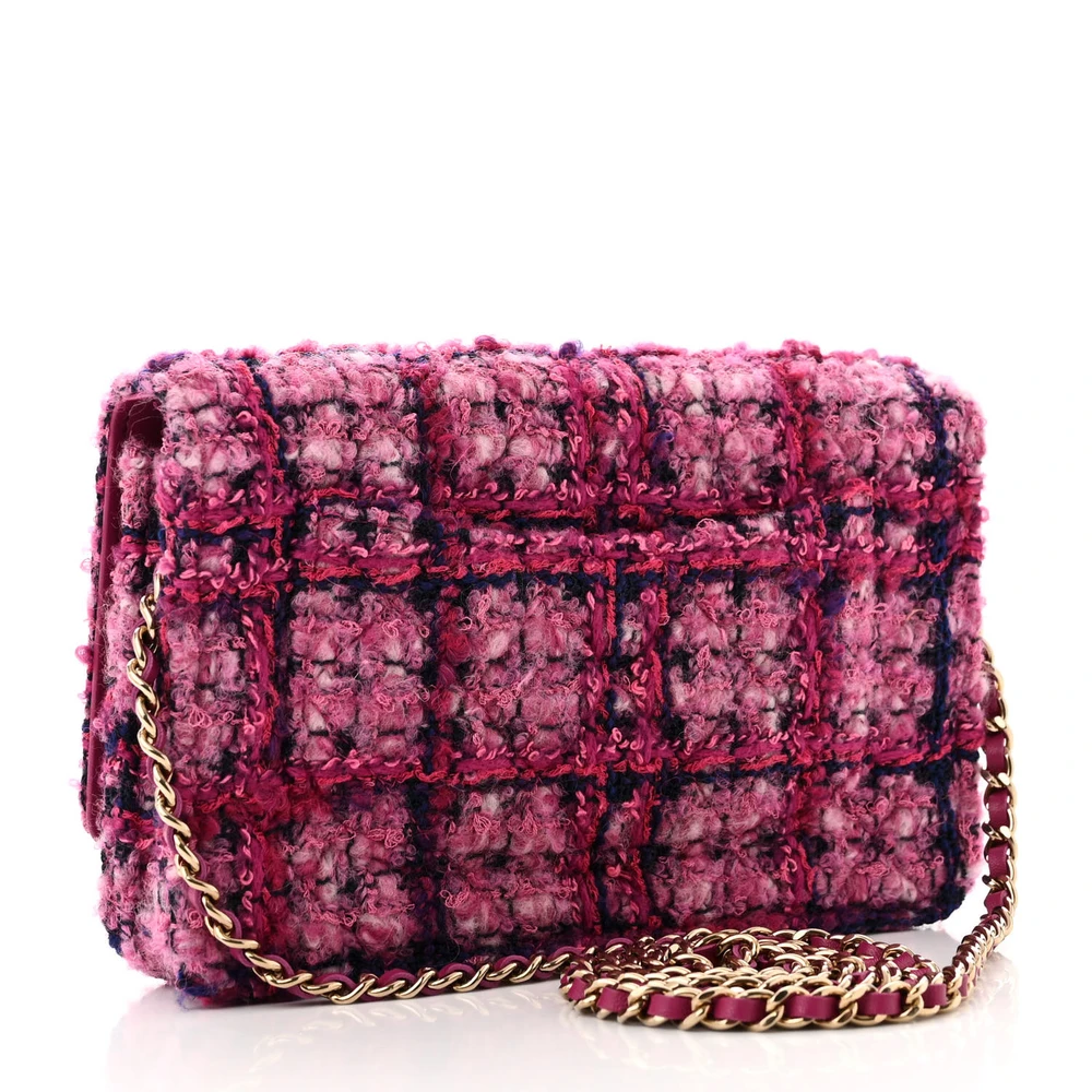 This Chanel Wallet On Chain (WOC) Small in Fuchsia/Purple Quilted Tweed with Light Gold Hardware is a charming blend of color and texture. The quilted tweed fabric showcases Chanel signature attention to detail. Light gold hardware complements its vibrant design, adding a touch of luxury. Compact and functional, perfect for carrying essentials in style. The chain strap allows for versatile carrying options. A delightful accessory for both casual and formal occasions.