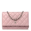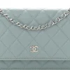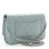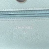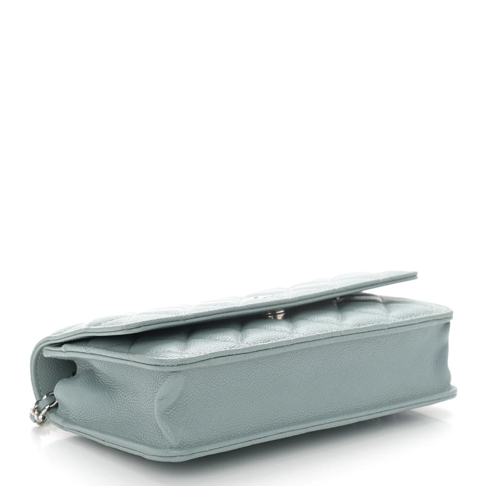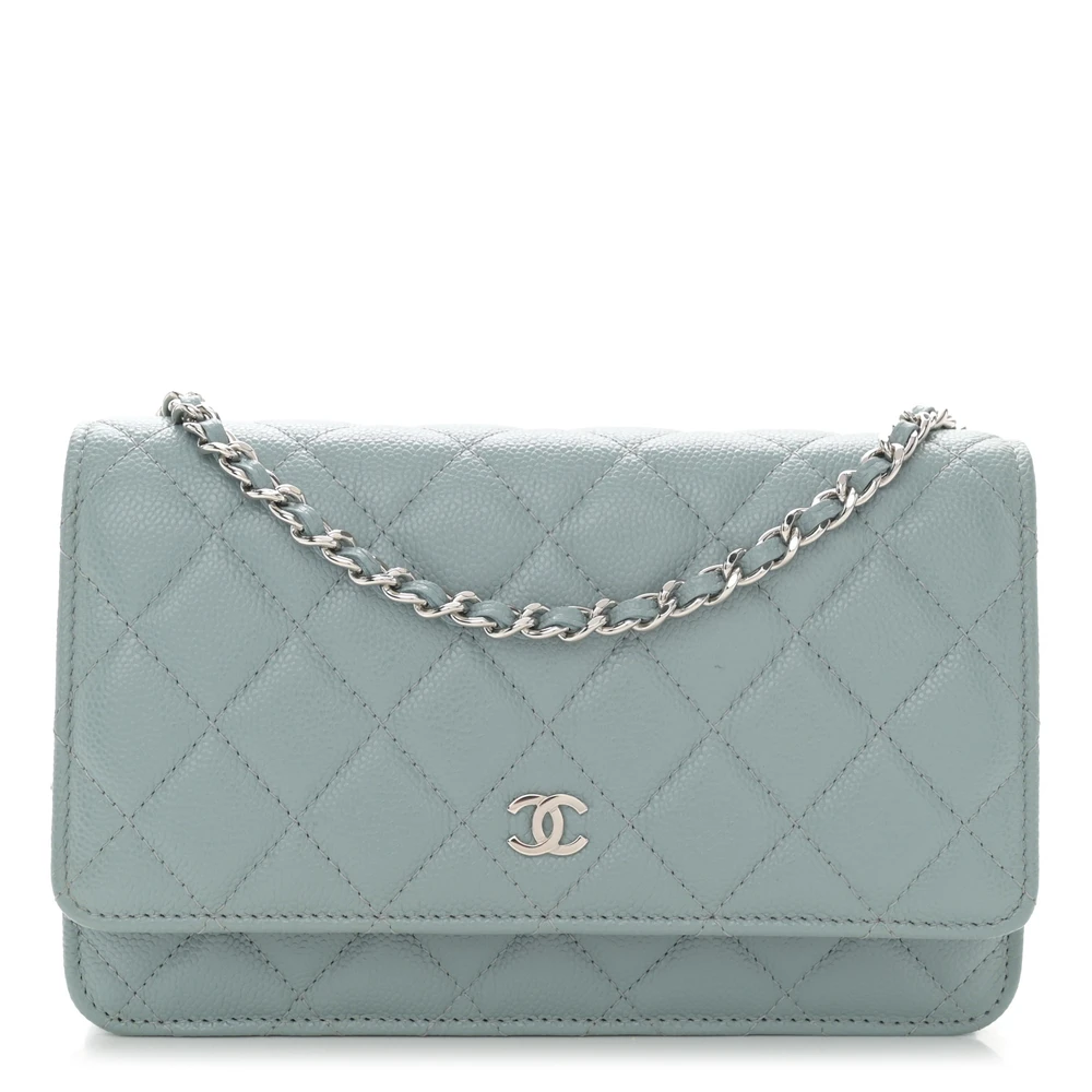 This Chanel Wallet On Chain (WOC) Small in Light Blue Quilted Caviar Leather with Silver Hardware is a fresh and elegant design. The durable caviar leather showcases Chanel signature quilting. Silver hardware adds a sleek and modern touch. Compact yet spacious enough for essentials,  perfect for day-to-evening transitions. The chain strap provides versatile carrying options. A stylish choice for any occasion.