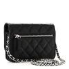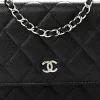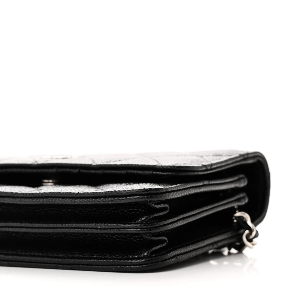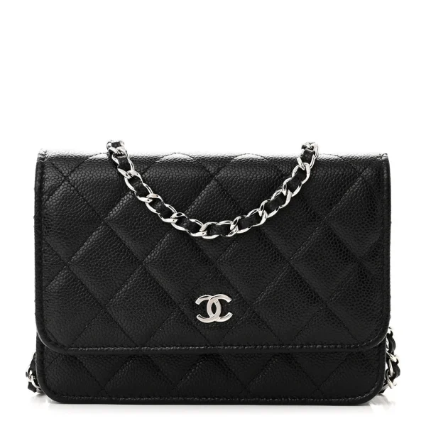 This Chanel Wallet On Chain (WOC) Mini in Black Quilted Caviar Leather with Silver Hardware is a compact and classic piece. The caviar leather ensures durability while maintaining its luxurious appeal. Silver hardware complements its quilted design, adding a refined touch. Perfect for on-the-go lifestyles, it features a secure closure and organized compartments. The chain strap allows for versatile wear, from crossbody to clutch. A timeless accessory for any occasion.