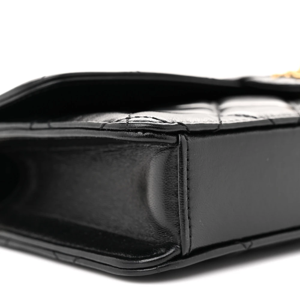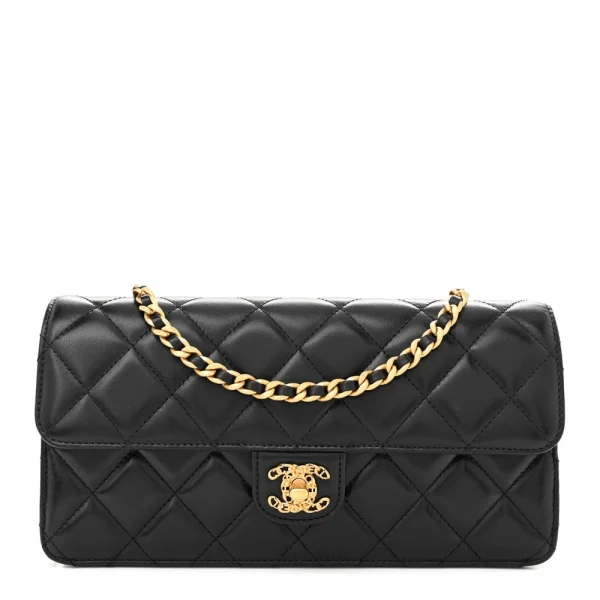 his Chanel Flap Clutch Small in Black Quilted Shiny Lambskin Leather with Gold Hardware is a sophisticated and versatile piece. The shiny lambskin leather adds a touch of glamour to its classic design. Gold hardware enhances its luxurious appeal. Compact yet spacious enough for essentials, perfect for evening outings. The flap closure combines elegance with functionality. A timeless addition to any Chanel wardrobe.