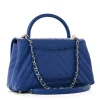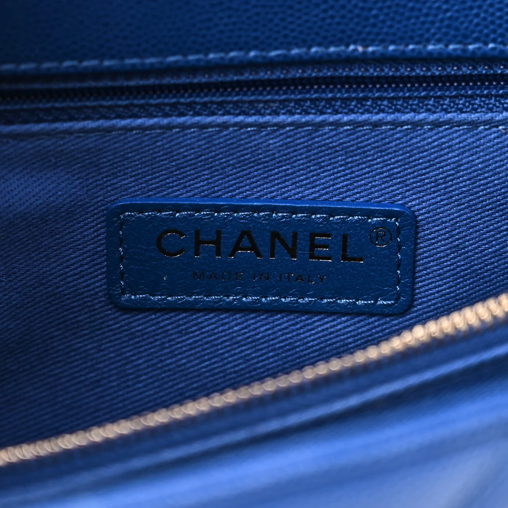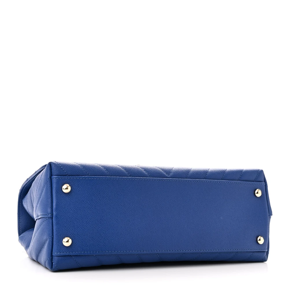 This Chanel Coco Handle Flap Small in Blue Chevron Quilted Caviar Leather with Light Gold Hardware is a chic and contemporary handbag. The chevron quilting adds a modern twist to the classic Chanel aesthetic. Durable caviar leather ensures long-lasting elegance, while light gold hardware enhances its polished look. Compact yet spacious, perfect for daily use or evening events. The top handle and flap closure provide a structured and sophisticated silhouette. A versatile piece for the modern Chanel lover.