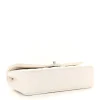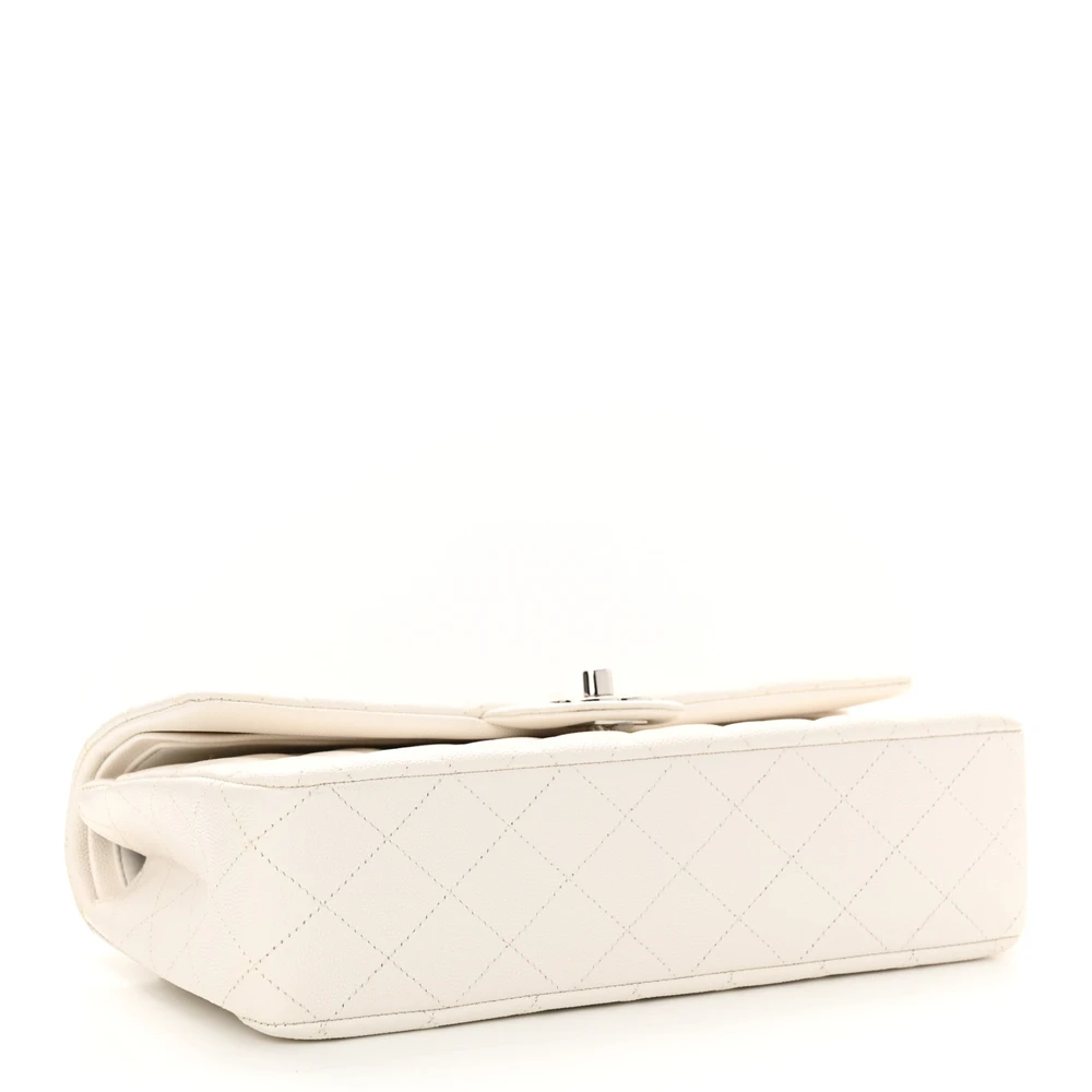 This Chanel Double Flap Medium in White Quilted Caviar Leather features silver hardware. The sleek and elegant design makes it versatile for any occasion. Spacious enough for essentials, perfect for both day and evening wear. The durable caviar leather ensures longevity and a polished finish. A classic and timeless piece for a sophisticated wardrobe. A must-have for Chanel lovers.
