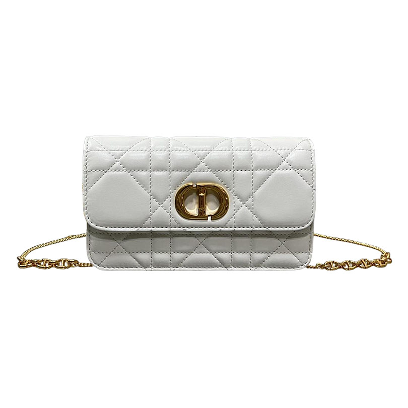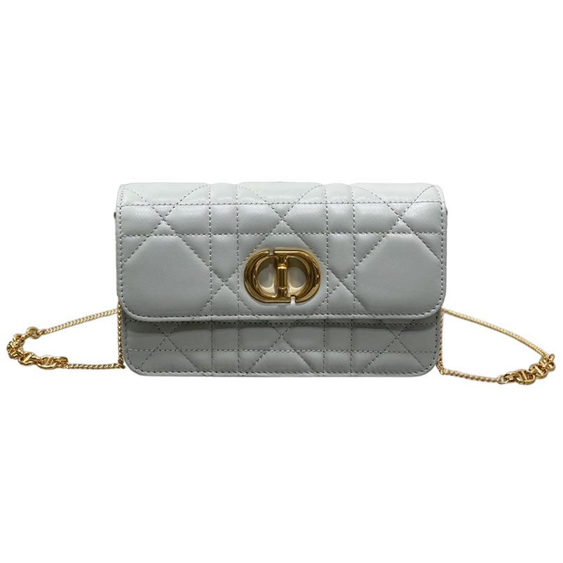 The Miss Caro pouch with chain is practical and graceful. Made in pink/blue/white/black lambskin enhanced by Macrocannage topstitching, it features a flap with an antique gold-finish metal CD twist clasp inspired by the seal of a Christian Dior perfume bottle, opening to reveal a compartment that will accommodate all the essentials. The chain strap allows it to be carried comfortably by hand, worn over the shoulder or crossbody as an ideal daily pouch.