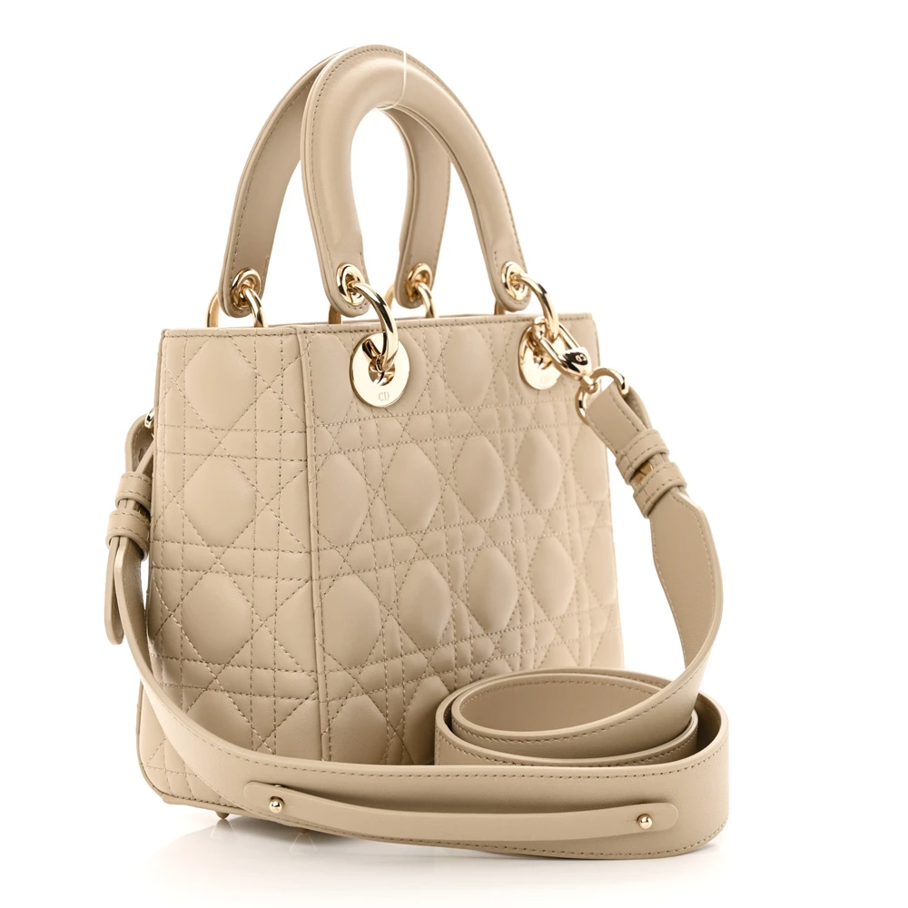This Dior Small My ABCDior Lady Dior in Corda Cannage Lambskin Leather exudes understated luxury. The gold hardware complements its soft beige hue for a refined aesthetic. Compact yet versatile, it’s a perfect accessory for any occasion. The customizable charm feature adds a personal touch.
