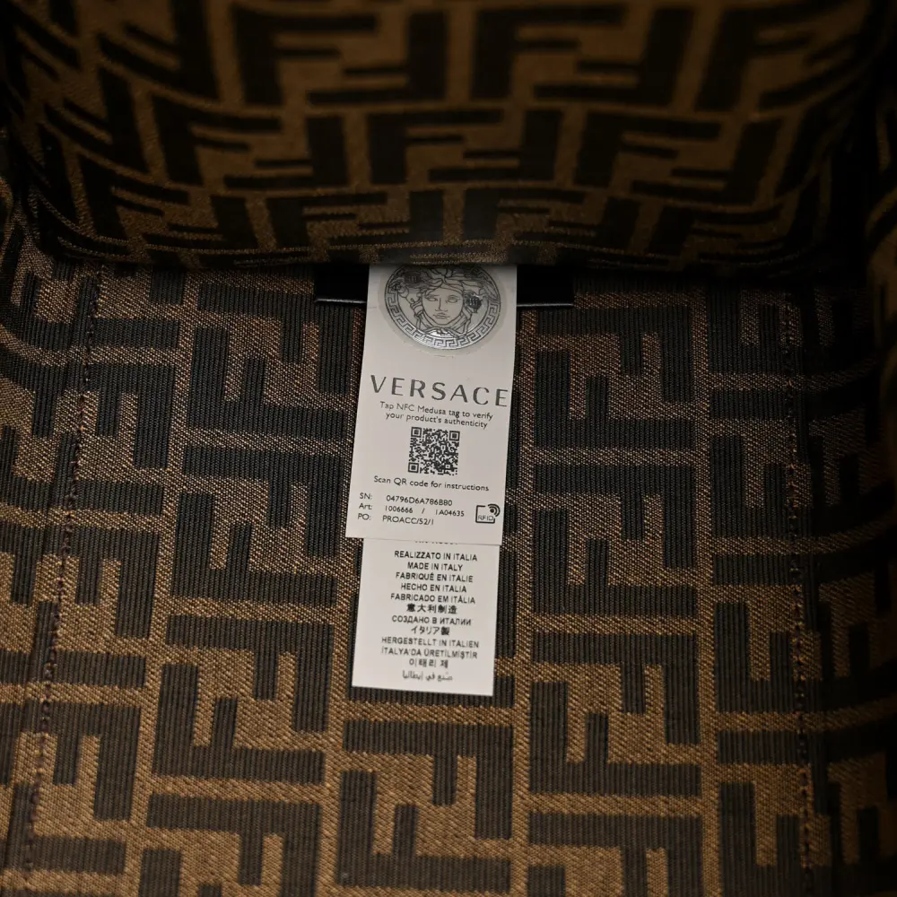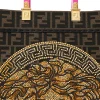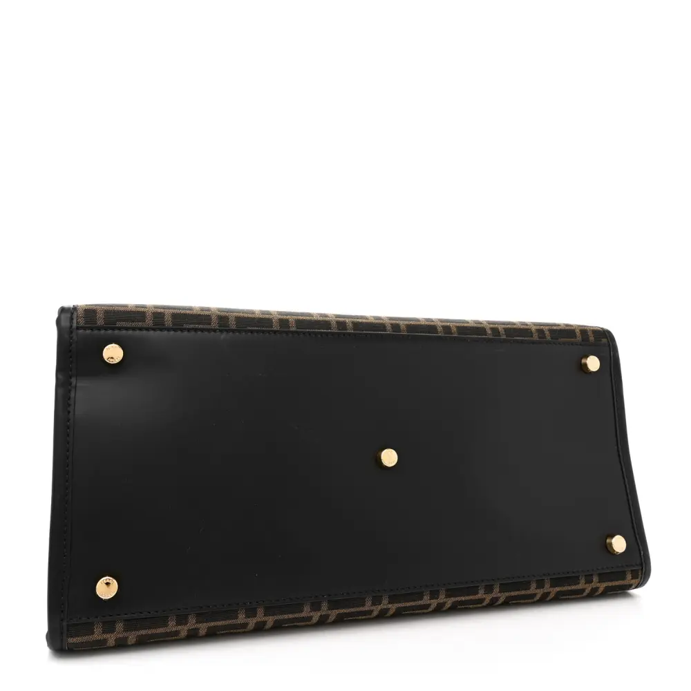 This Fendi Large Fendace FF Medusa Studded Fendi Sunshine Shopper Tote in Brownluxurious. Jacquard Fabric, Calfskin Leather, and Plexiglass create a striking mix. Gold hardware enhances its unique design. Spacious and functional, it’s perfect for carrying essentials in style. A true statement piece for standout looks. Perfect for fashion-forward individuals.