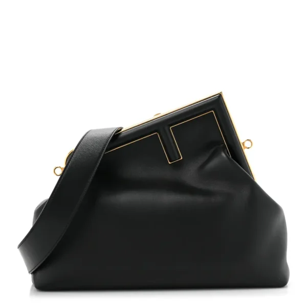 This Fendi Medium Fendi First in Black is sleek. Shiny Nappa Leather and gold hardware create a luxurious feel. Spacious yet compact for your essentials. Perfect for day-to-evening transitions. A timeless addition to your wardrobe. Chic and versatile for modern elegance.