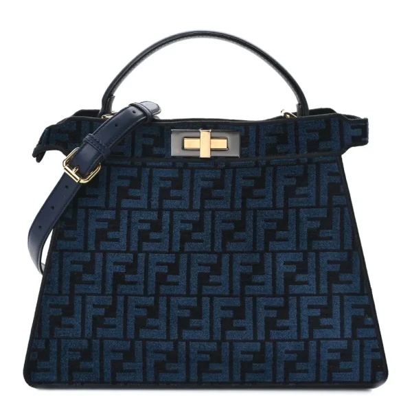 Fendi Medium FF Peekaboo I SEE U Satchel Blue/Black Chenille & Vitello Seta Leather Gold Hardware