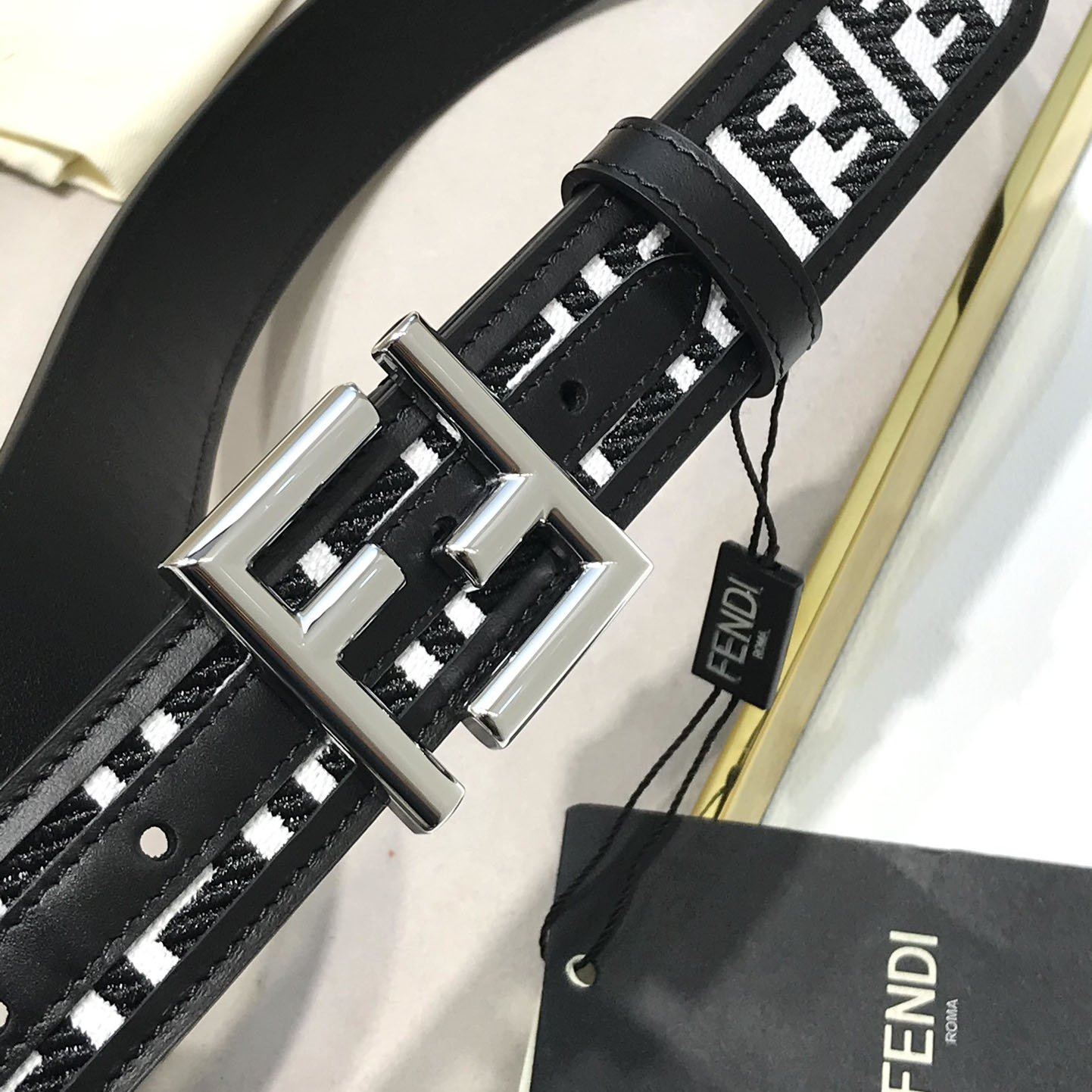 Fendi Men’s FF Buckle Belt In Black/White FF Canvas With Gold/Silver Hardware 35mm