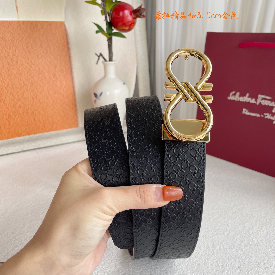 Ferragamo Men’s Double Buckle Reversible Belt In Black/Coffee Gancini Monogram Calfskin With Gold/Silver/Gun Black Hardware 35mm