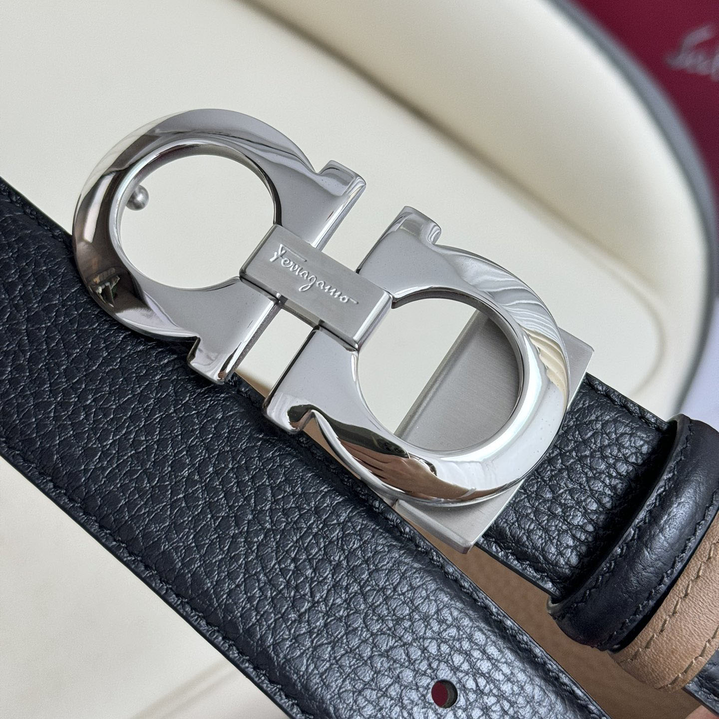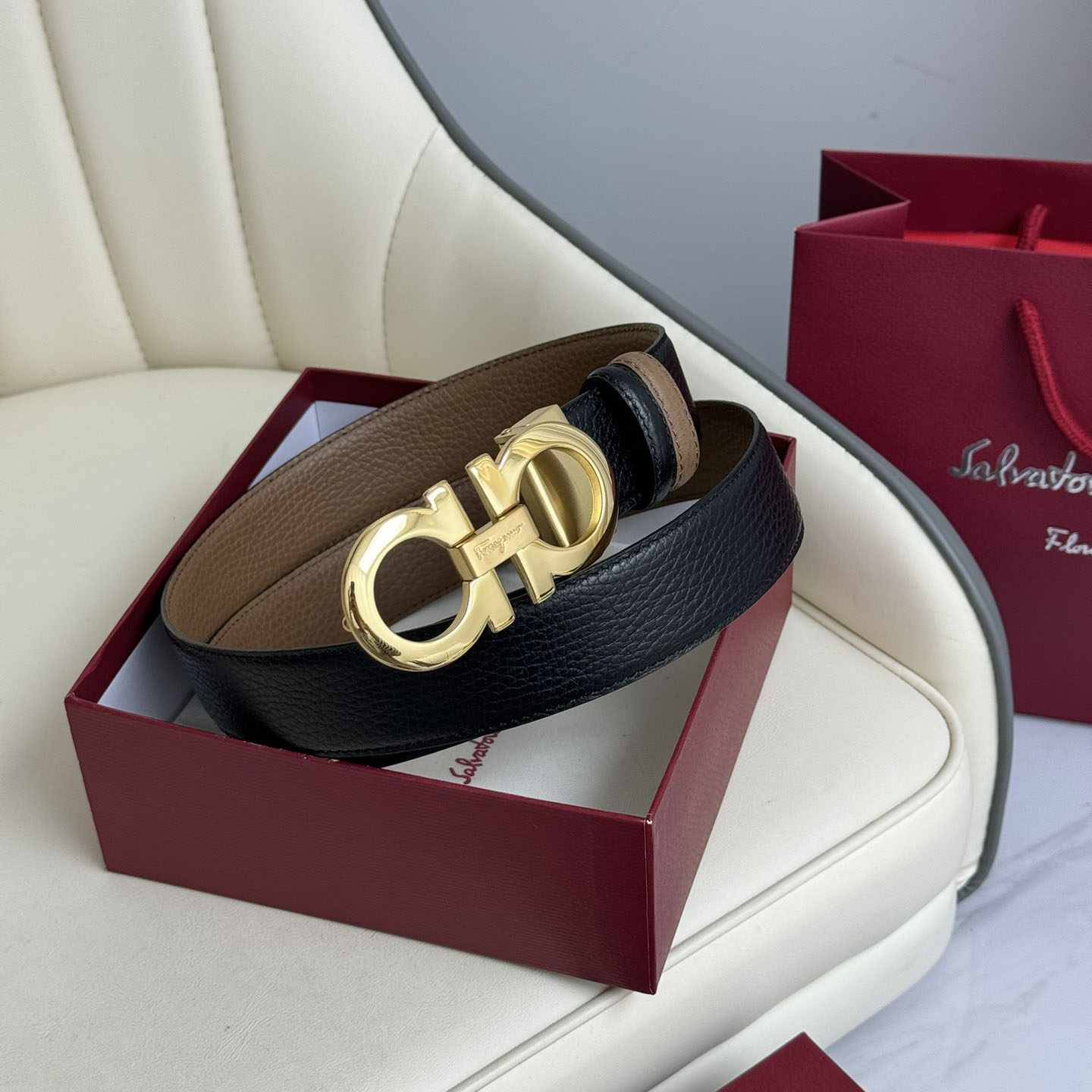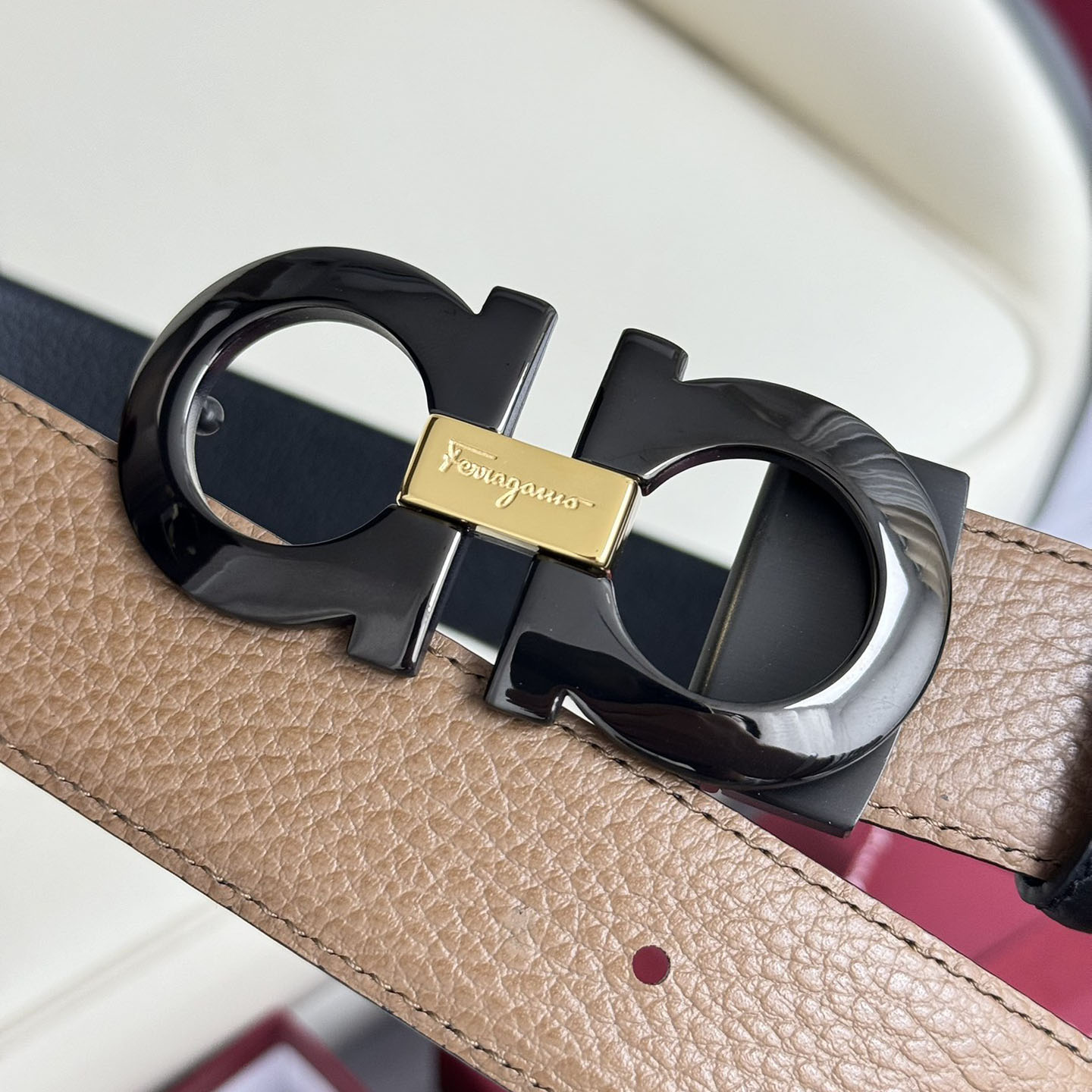 Ferragamo Men’s Double Gancini Buckle Reversible Belt In Black/Brown Grained Calfskin With Gold/Silver/Black Hardware 35mm