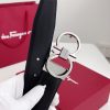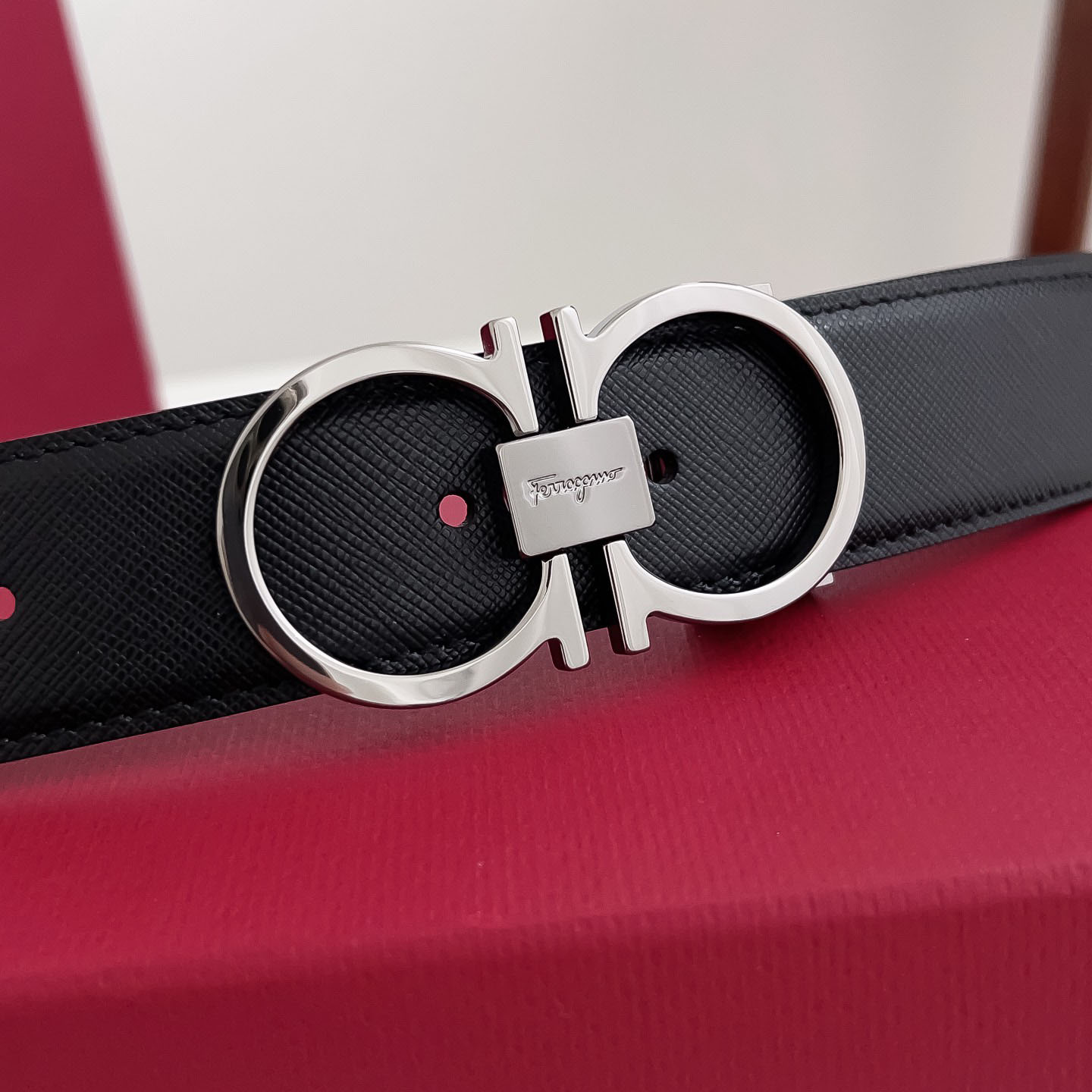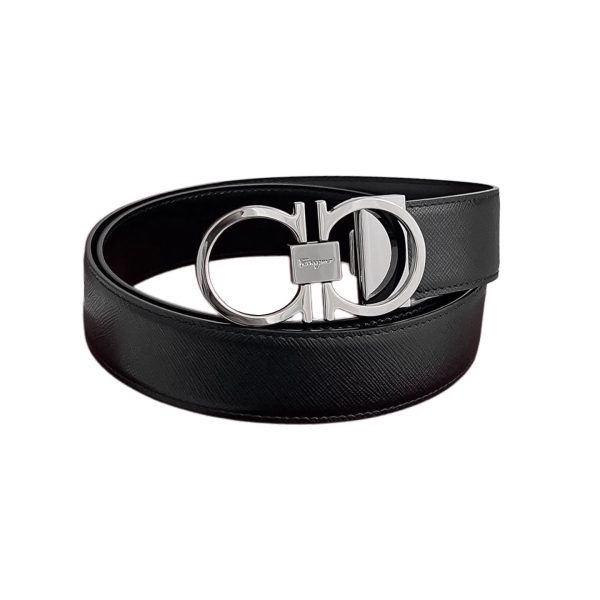 Ferragamo Men’s Thin Double Gancini Buckle Reversible Belt In Black Saffiano Calfskin With Gold/Silver Hardware 35mm