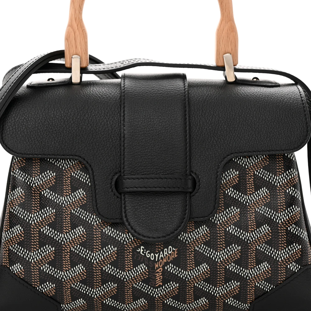 This Goyard Mini Saigon Bag in Black is crafted from Goyardine canvas with silver hardware. Its structured trunk silhouette is complemented by leather trims and wooden side panels. The compact design is perfect for essentials, offering both style and function. A detachable strap adds versatility for crossbody or hand carry.