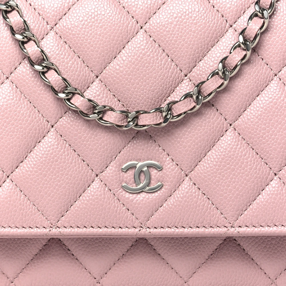 This Chanel Wallet On Chain (WOC) Small in Light Pink Quilted Caviar Leather with Silver Hardware is a delicate and stylish accessory. The soft pink hue is complemented by Chanel durable quilted caviar leather. Silver hardware adds a sleek and modern contrast to its feminine design. Compact and functional, it offers organized compartments for essentials. The chain strap provides versatile carrying options. A chic piece for day or evening wear.