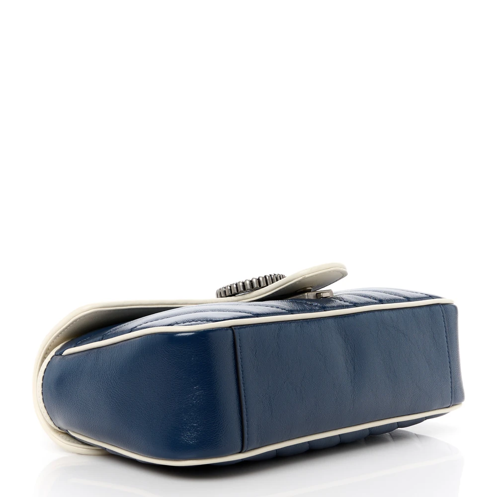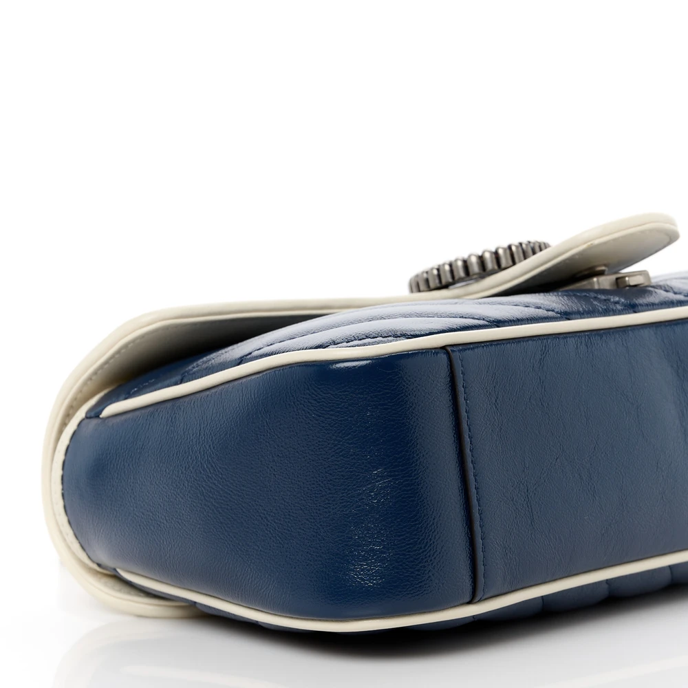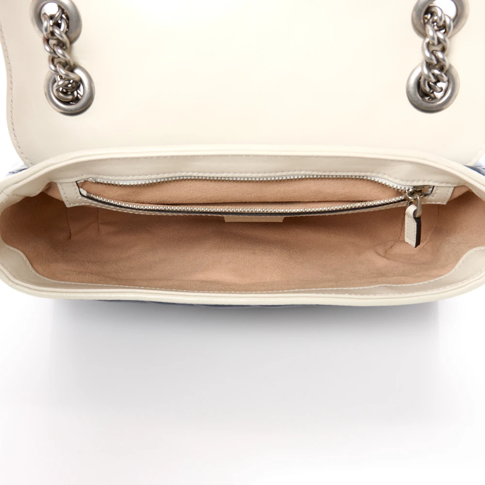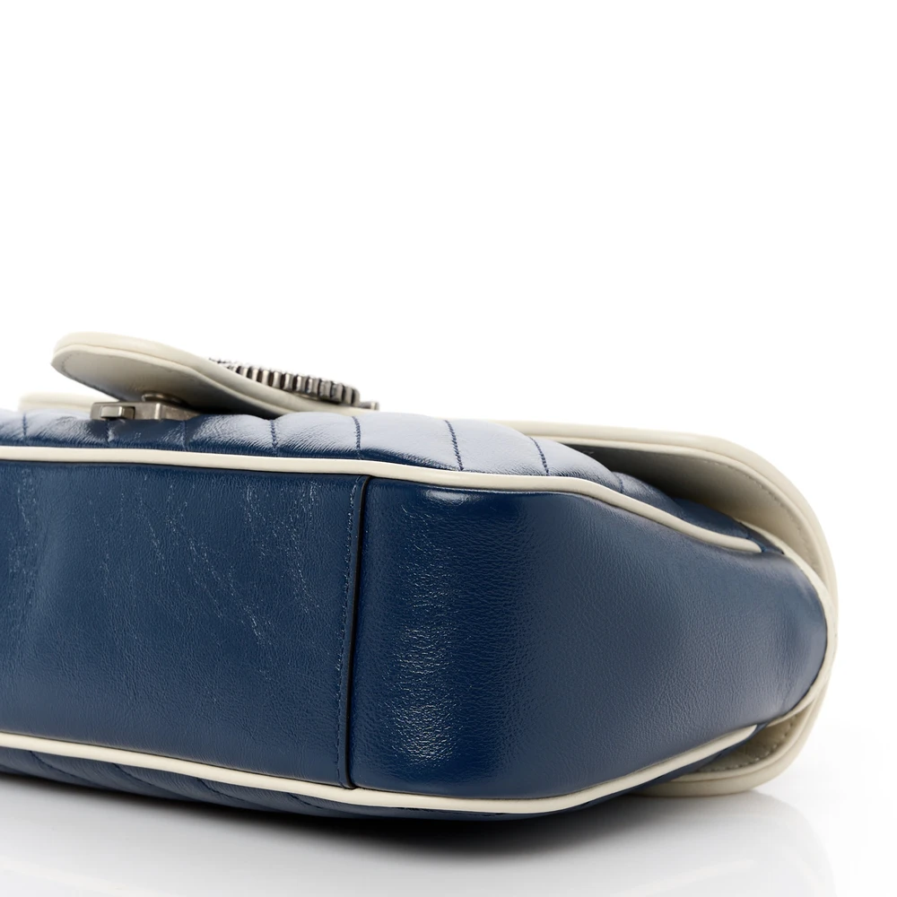 Gucci Small Torchon GG Marmont Shoulder Bag Blue Agata / Mystic White Vintage Effect Calfskin Leather Matelassé Diagonal Aged Silver Hardware