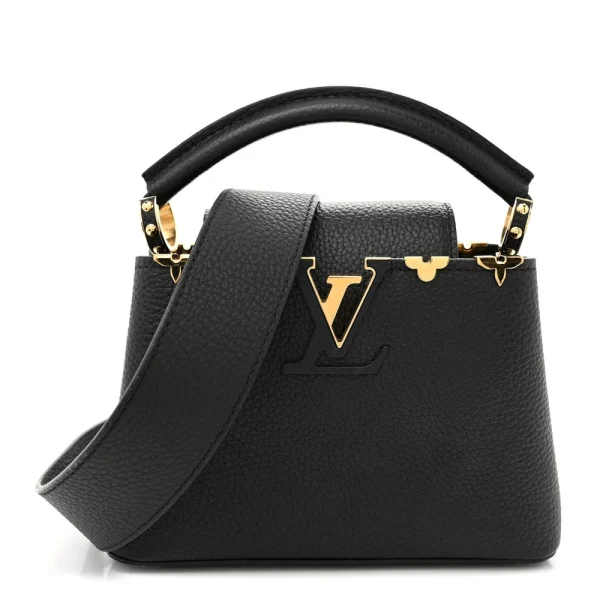 This Louis Vuitton Taurillon Embellished Flower Crown Capucines Mini in black is a luxurious and artistic piece crafted from textured black taurillon leather. The flower crown detail and polished gold hardware make it a bold, elegant statement. The interior, lined in black leather with a partition, ensures organized storage while maintaining its chic design.