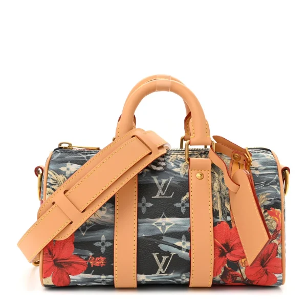 This Louis Vuitton Surfin Keepall Bandouliere 25 Navy Blue Monogram Canvas Gold Hardware is a sleek and functional bag made from Monogram canvas in a striking navy blue. The gold hardware adds a touch of luxury, while the roomy interior makes it perfect for short trips or everyday use.
