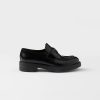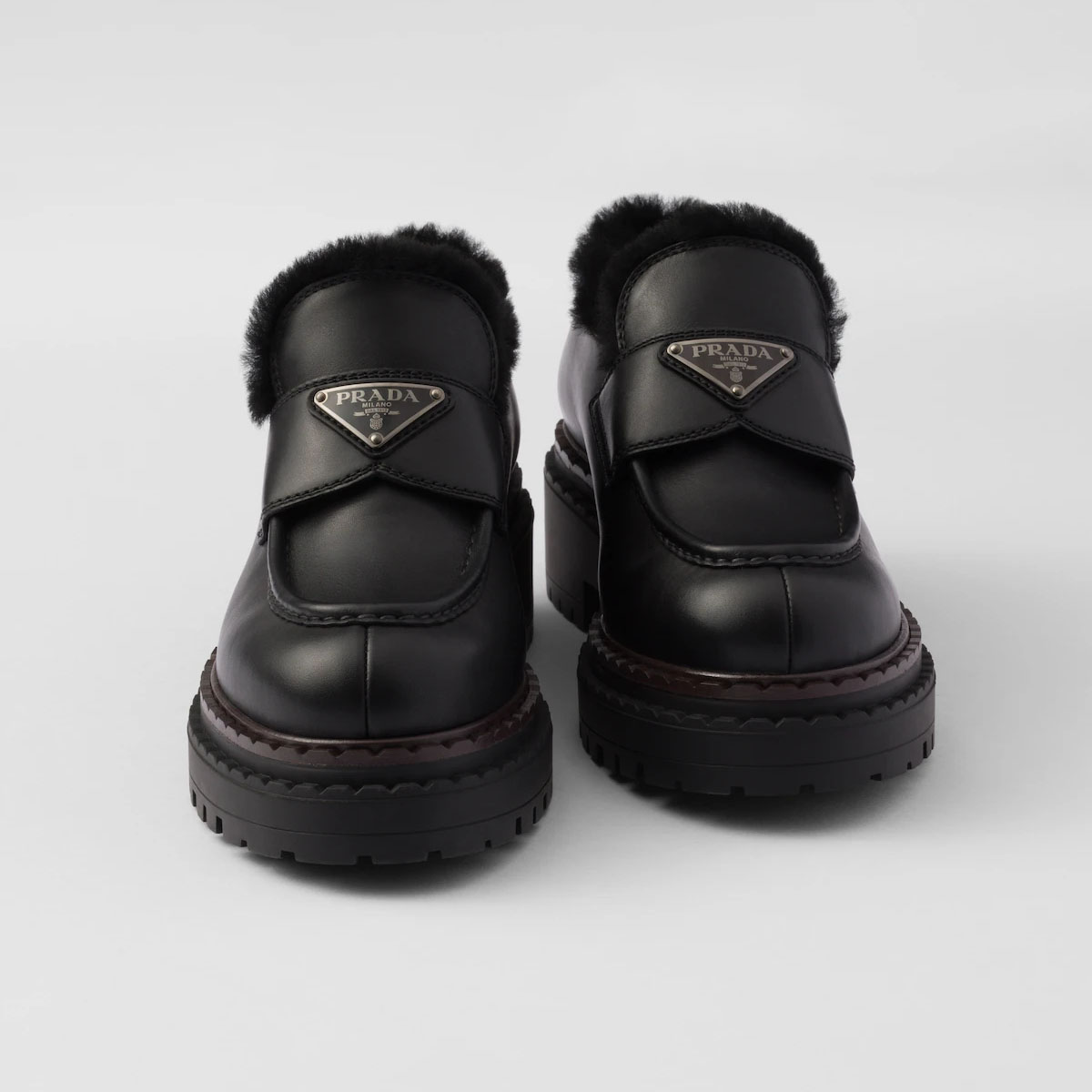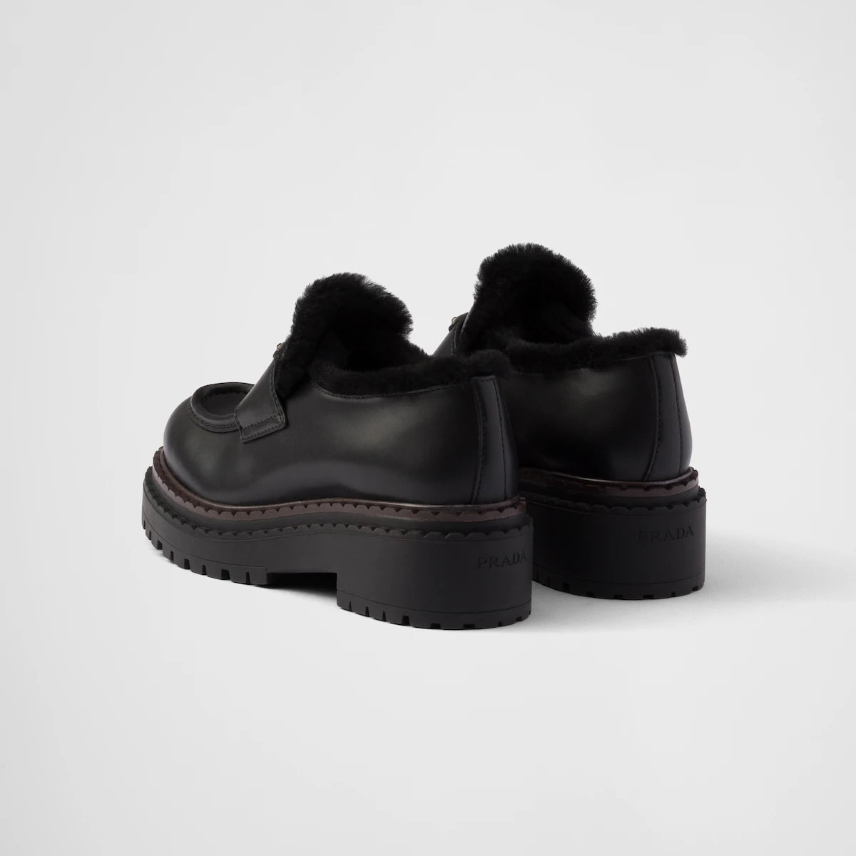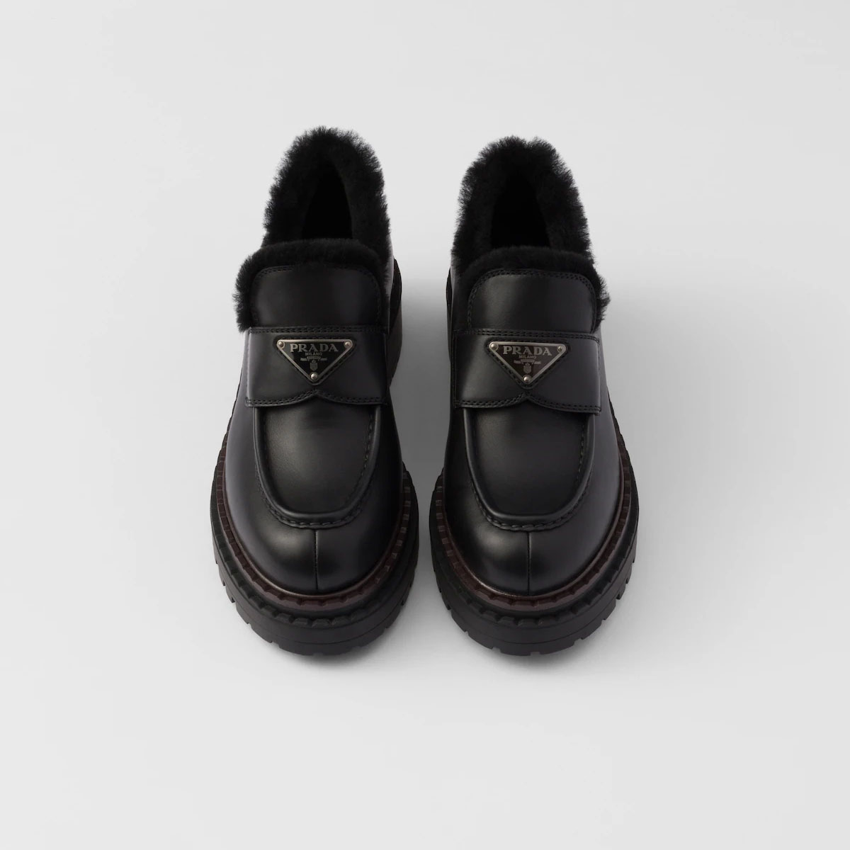 PRADA Black double fabric Chocolate leather and sheep fur loafers