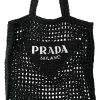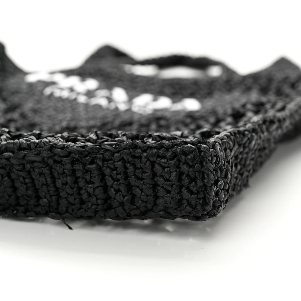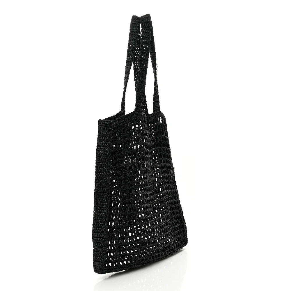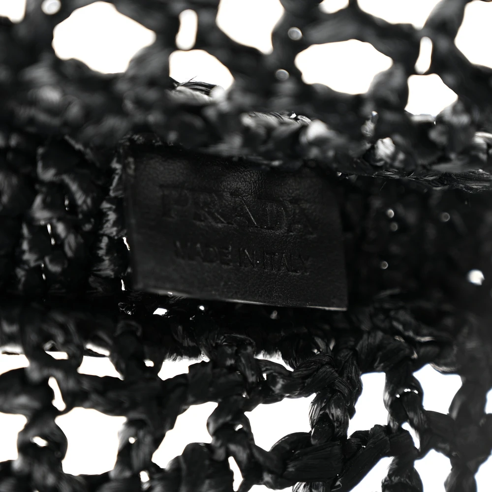 Prada Medium Effect Crochet Logo Embroidered Tote Bag Black Yarn Raffia