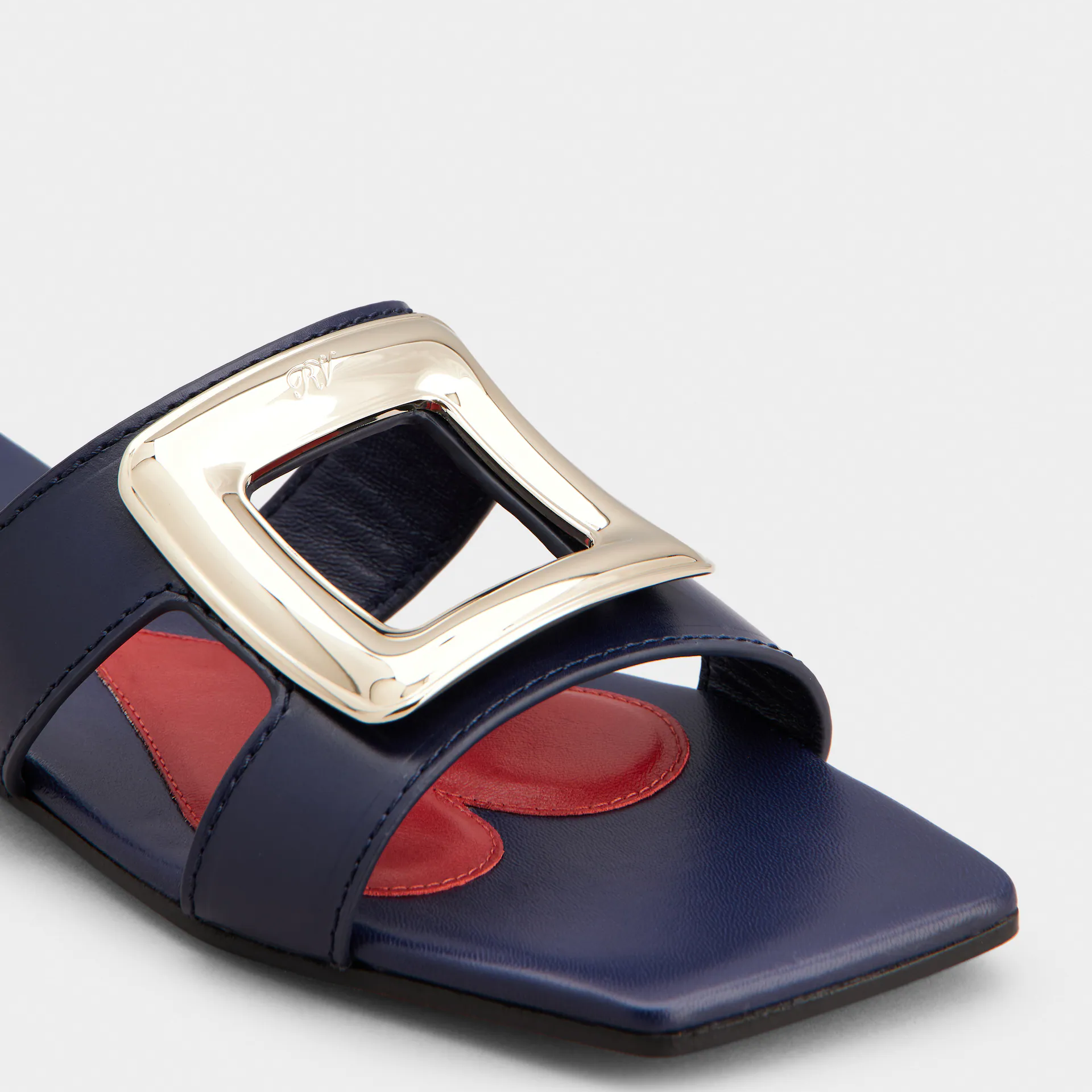 Roger Vivier Viv’ By The Sea Mules Flats In Navy Blue Leather With Metal Buckle