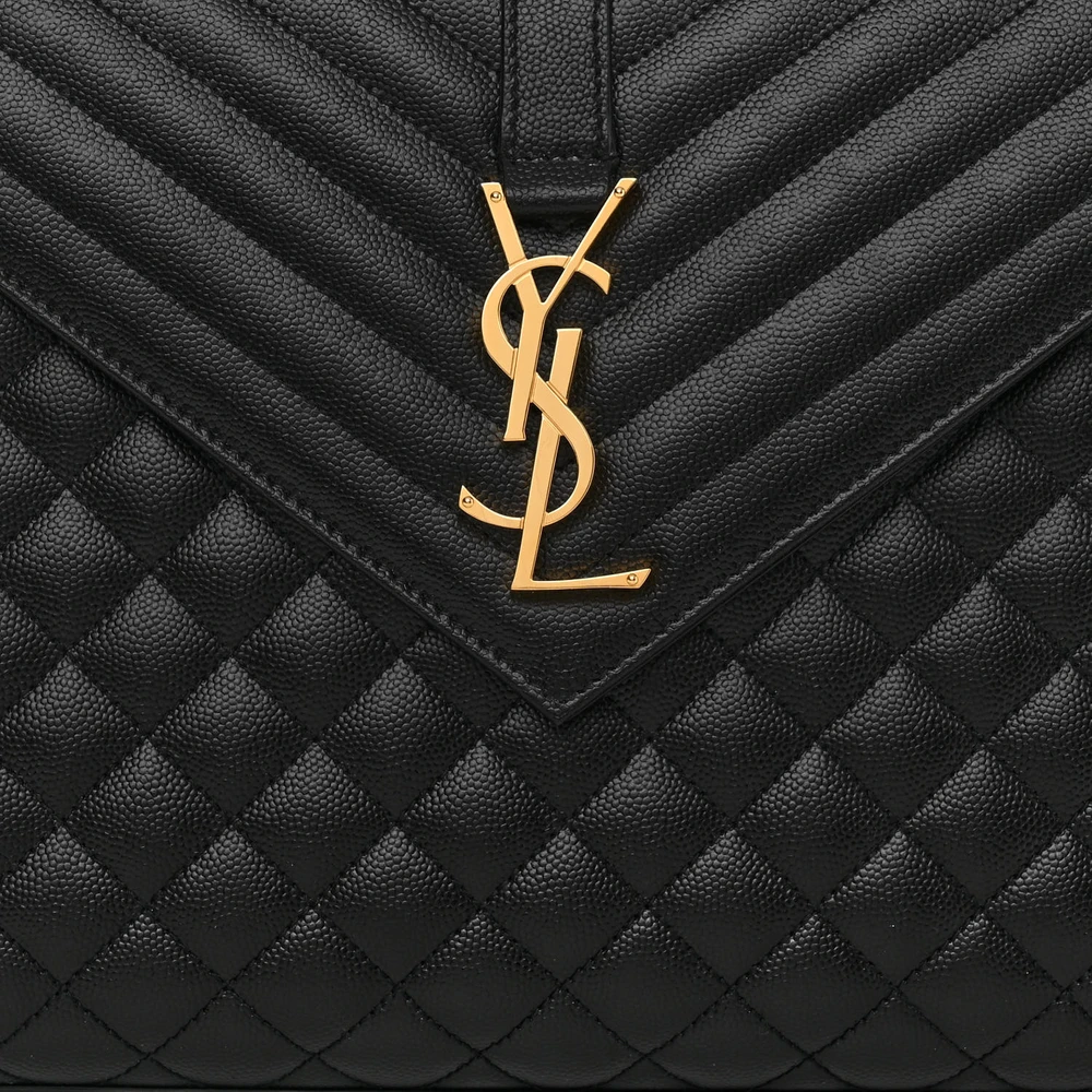 This Saint Laurent Large Satchel in Black showcases Triquilt Monogram Grain De Poudre Leather with mixed matelasse textures. Gold hardware enhances its luxurious appeal, while the spacious interior offers practicality. A sophisticated choice for those who appreciate bold yet timeless design. Perfect for elevating everyday outfits with elegance.