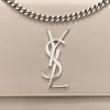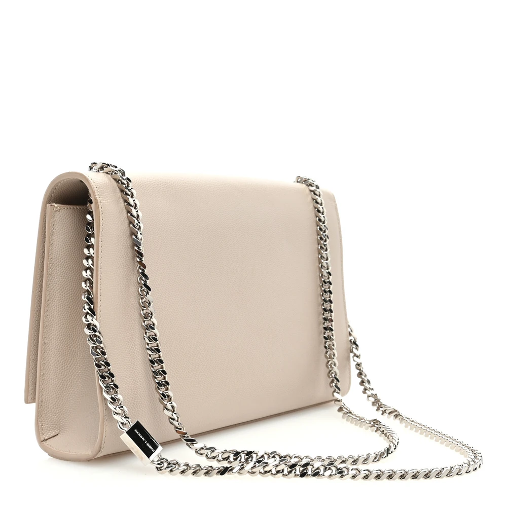 This Medium Kate Satchel in white features Monogram Grain De Poudre Leather with silver hardware. The sleek and structured design is ideal for carrying essentials in style. Its flap closure and chain strap offer practicality, while the iconic YSL logo adds timeless elegance. A versatile choice for day-to-night transitions.
