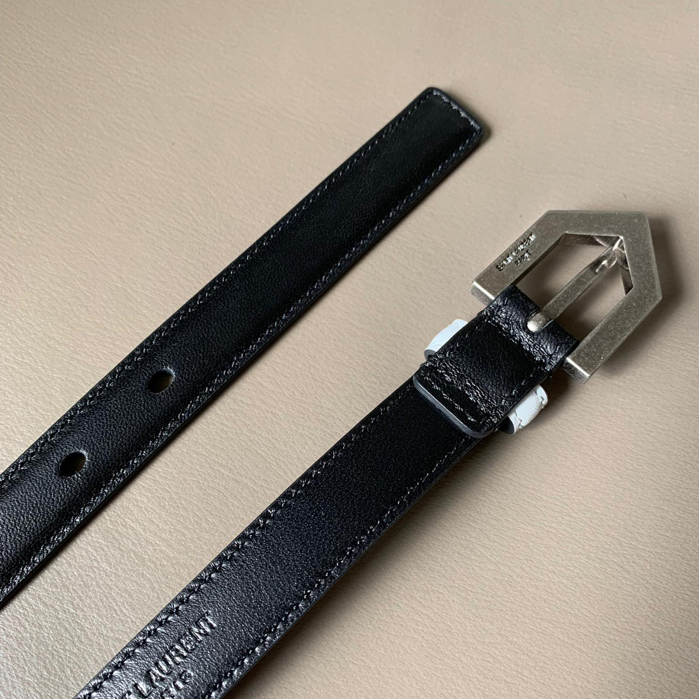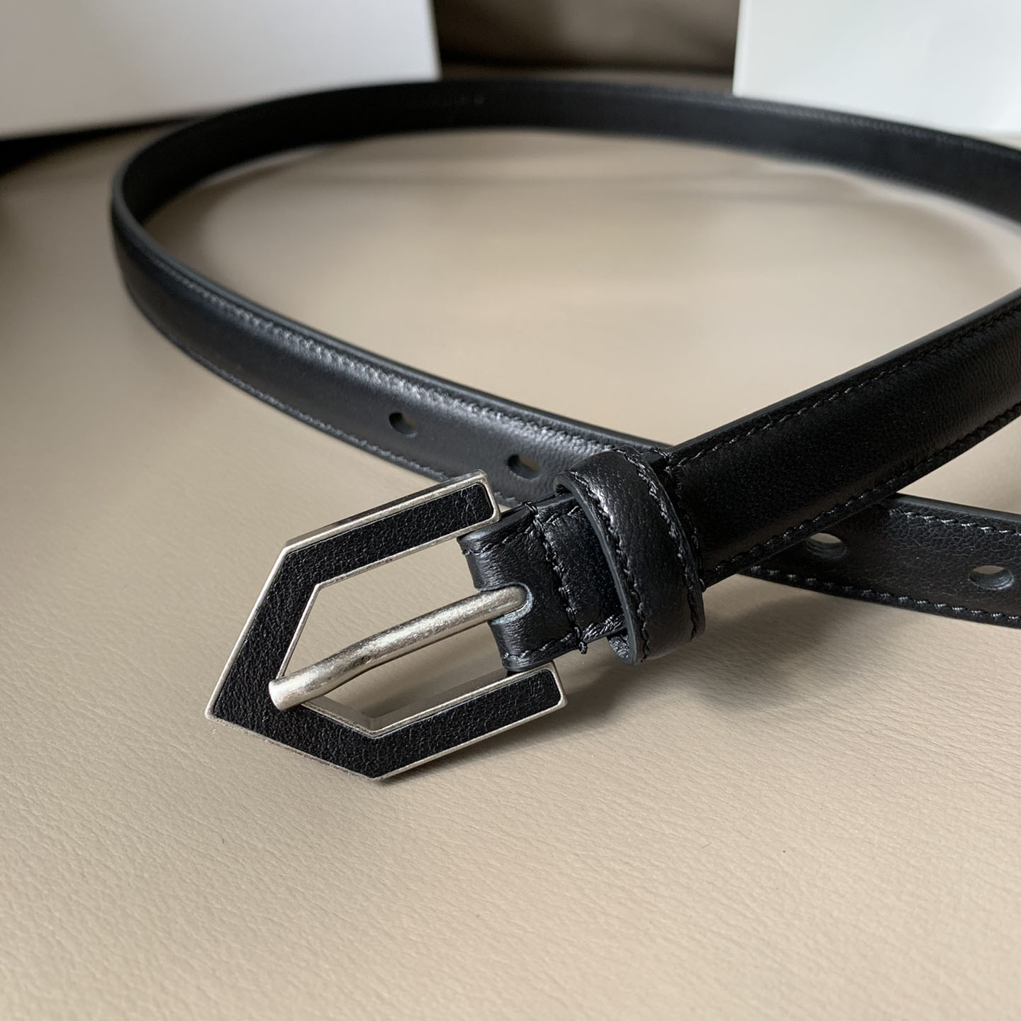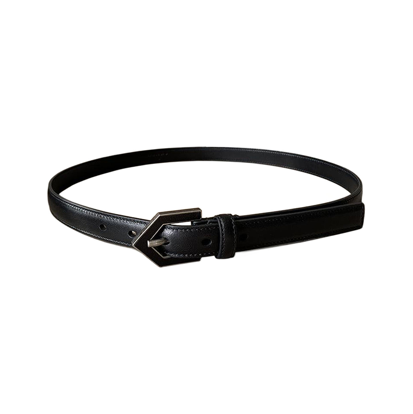 Saint Laurent Triangle Frame Buckle Thin Belt In Black/White Smooth Calfskin With Silver Hardware 20mm