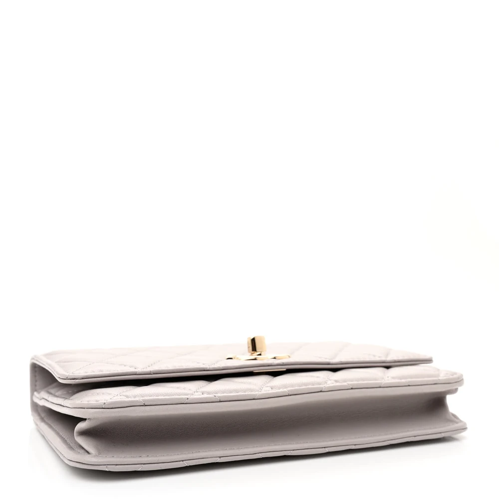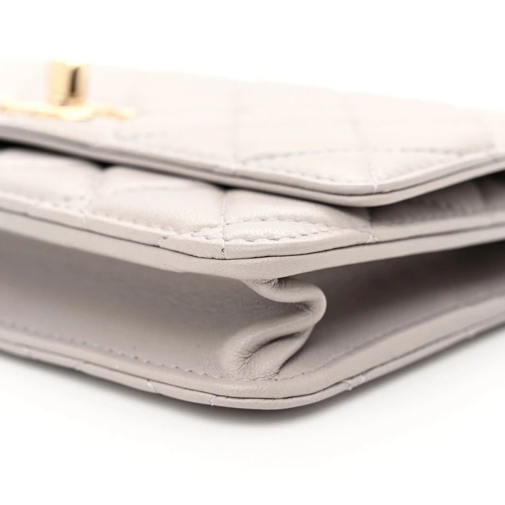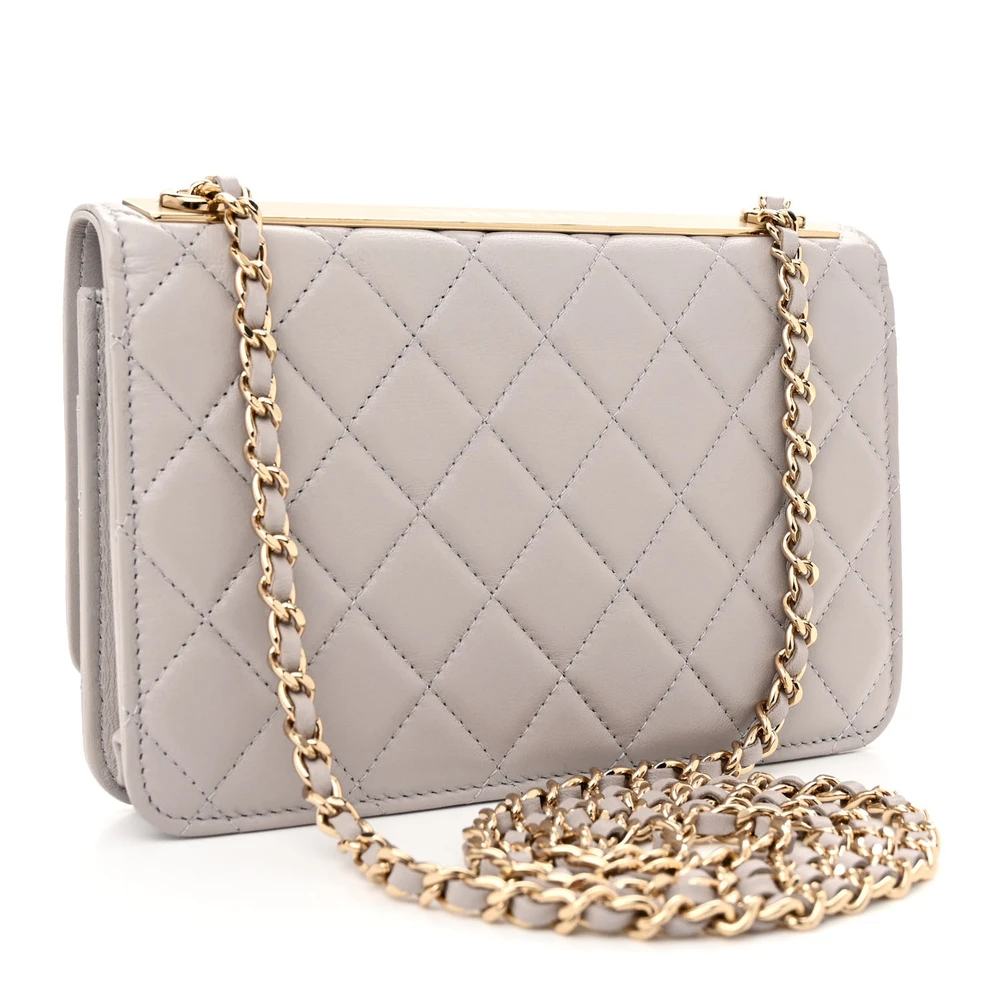 This Chanel Trendy CC Wallet On Chain (WOC) Small in Grey Quilted Lambskin Leather with Gold Hardware is a blend of elegance and functionality. The lambskin leather is soft to the touch, featuring Chanel signature quilted design. Gold hardware adds a refined and luxurious finish to its sophisticated silhouette. Compact yet practical, it offers organized space for essentials. The versatile chain strap allows for crossbody or shoulder wear. A chic and timeless piece for any occasion.